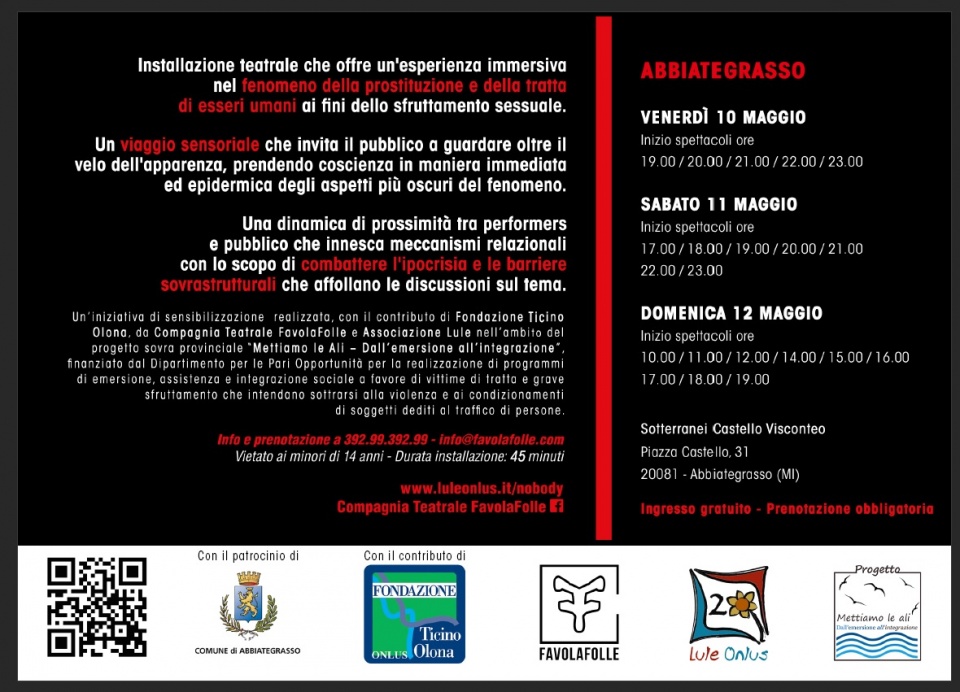 “NoBody” è un’installazione teatrale realizzata dalla Compagnia Teatrale FavolaFolle, in collaborazione con Associazione Lule Onlus, sul fenomeno della tratta e dello sfruttamento sessuale, all’interno del progetto “Mettiamo le Ali 3″ (iniziativa finanziata dal Dipartimento per le Pari Opportunità).